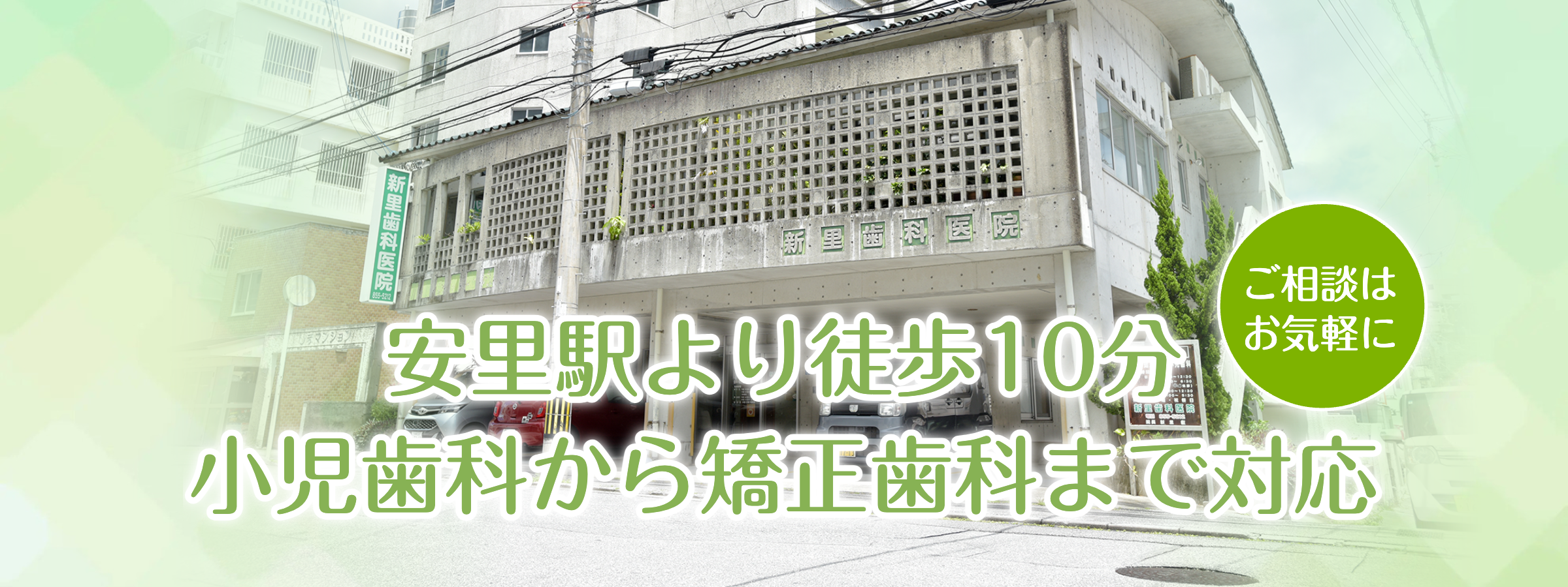 那覇市の「新里歯科・矯正歯科」は、小さなお子さまから大人の方まで幅広く対応できる歯医者です。一般歯科をはじめ、痛みの少ない治療、こどもの歯科治療、矯正歯科、入れ歯治療など多くの診療に取り組んでいます。