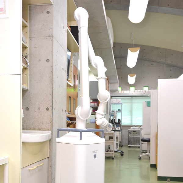 例えば、治療中にお口の外へ飛び散る削りカスや血液、唾液などが飛散しないよう「口腔外バキューム」で吸引し、飛沫感染を防いでいます。